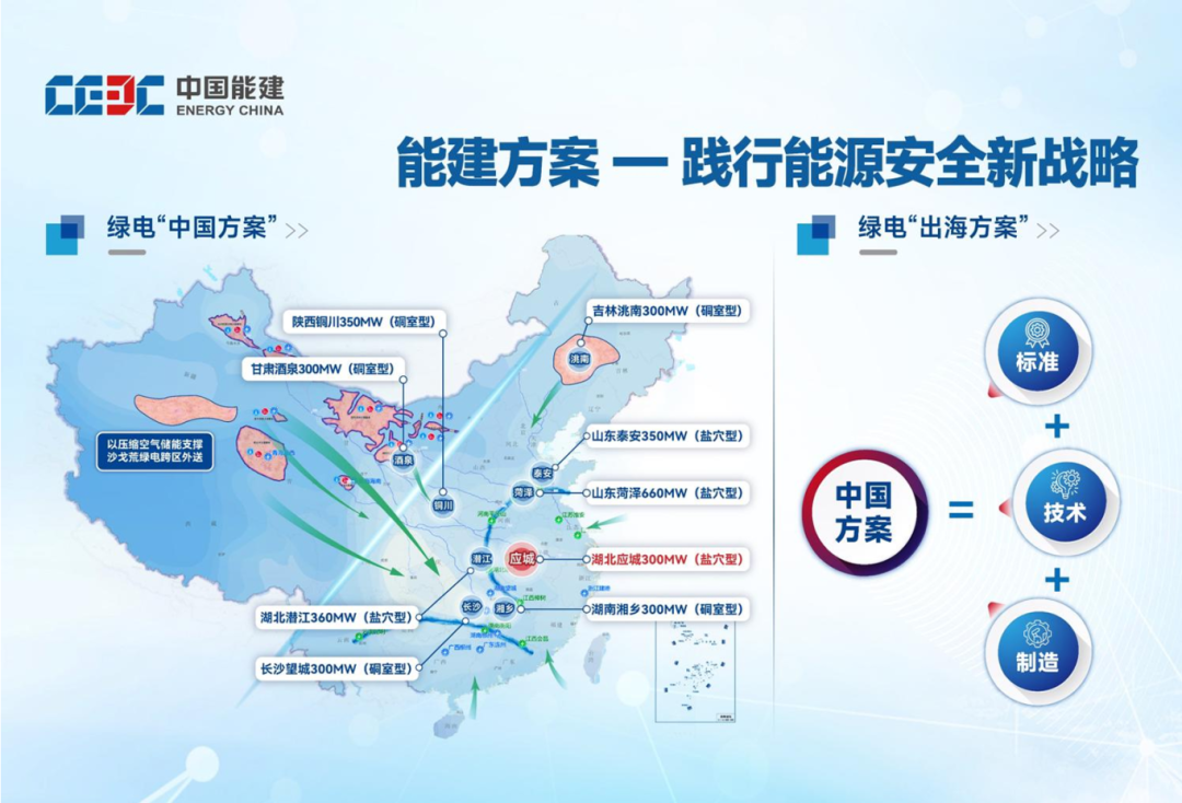 中国能建作为能源建设领域的主力军、国家队,依托全产业链业务优势,超前布局战略性新兴产业和未来产业,聚力打造全球领先的“中国能建压气储能系统解决方案”,取得了一系列以湖北应城项目为典型代表的创新成果:发布中国能建660兆瓦压气储能系统解决方案、海南州全绿色电站示范基地规划,启动湖北潜江5×350兆瓦、山东菏泽3060兆瓦新型储能基地和甘肃酒泉、山东泰安、陕西铜川等一系列示范项目建设。
