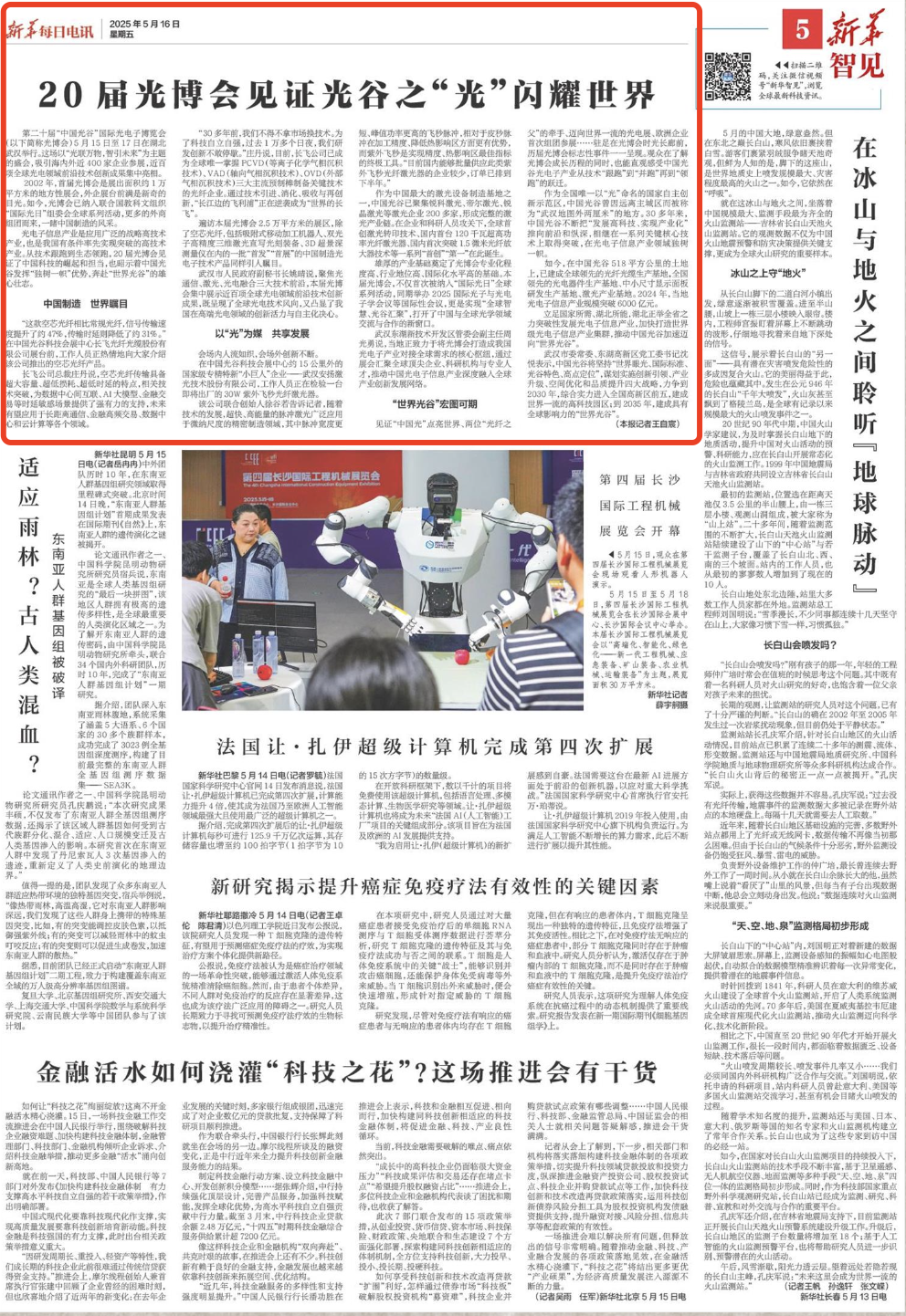 5月16日,新华每日电讯刊登报道《20届光博会见证光谷之“光”闪耀世界》。以下为全文转载。