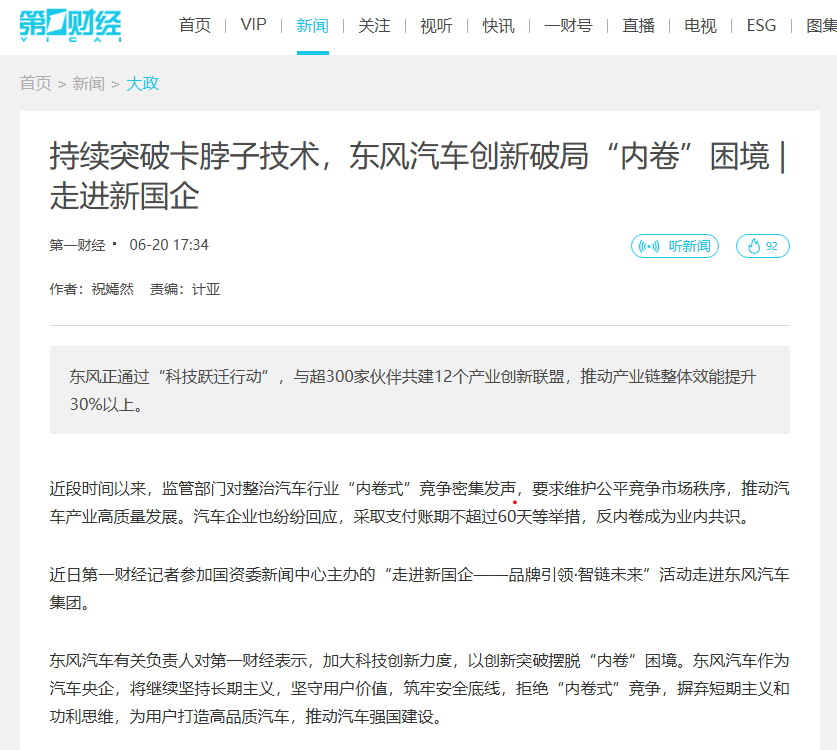 近日,第一财经发布报道《持续突破卡脖子技术,东风汽车创新破局“内卷”困境|走进新国企》,聚焦东风汽车坚持长期主义,坚守用户价值,拒绝“内卷式”竞争,通过科技创新突破“卡脖子”技术,积极履行链主职责,培养行业领先的科研人才,助力中国汽车行业高质量发展。以下是全文转载。