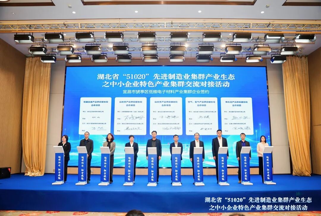 活动现场成果丰硕、务实高效。宜昌市猇亭区低维电子材料、荆门市掇刀区新能源动力电池等5家国家级产业集群所在县(市、区)政府领导发布了集群高质量发展实施方案、产业链图谱及供需清单。5个集群内25对上下游企业现场签署供需合作协议,签约金额达7.16亿元,进一步提升了重点产业链的本地配套率与协同水平。