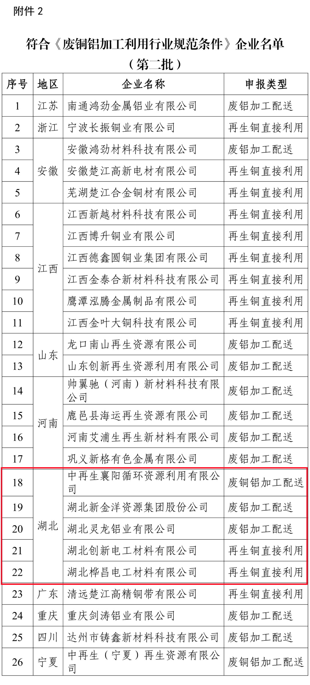 2.符合《废铜铝加工利用行业规范条件》企业名单(第二批)