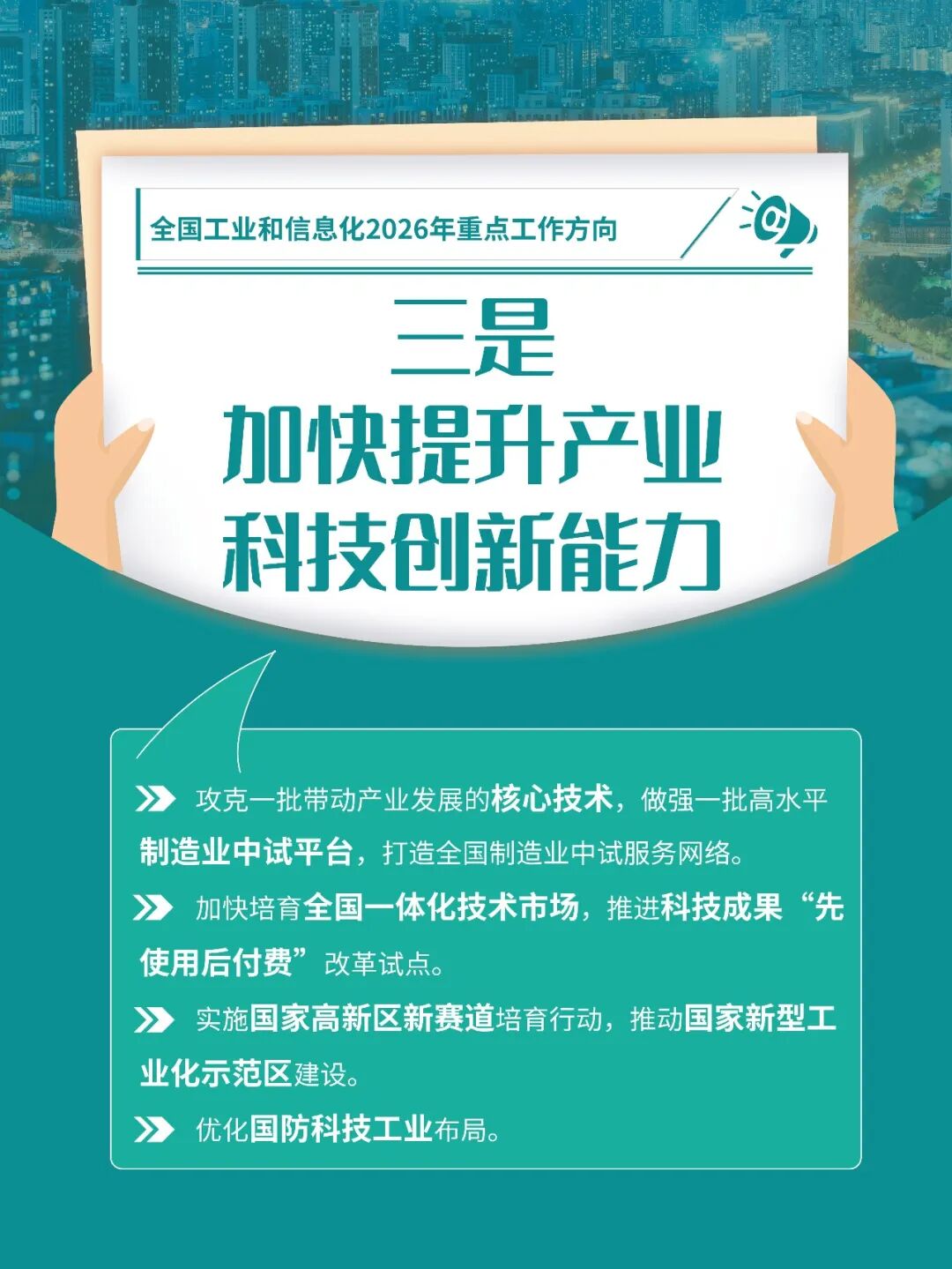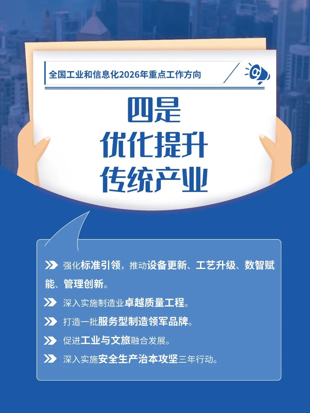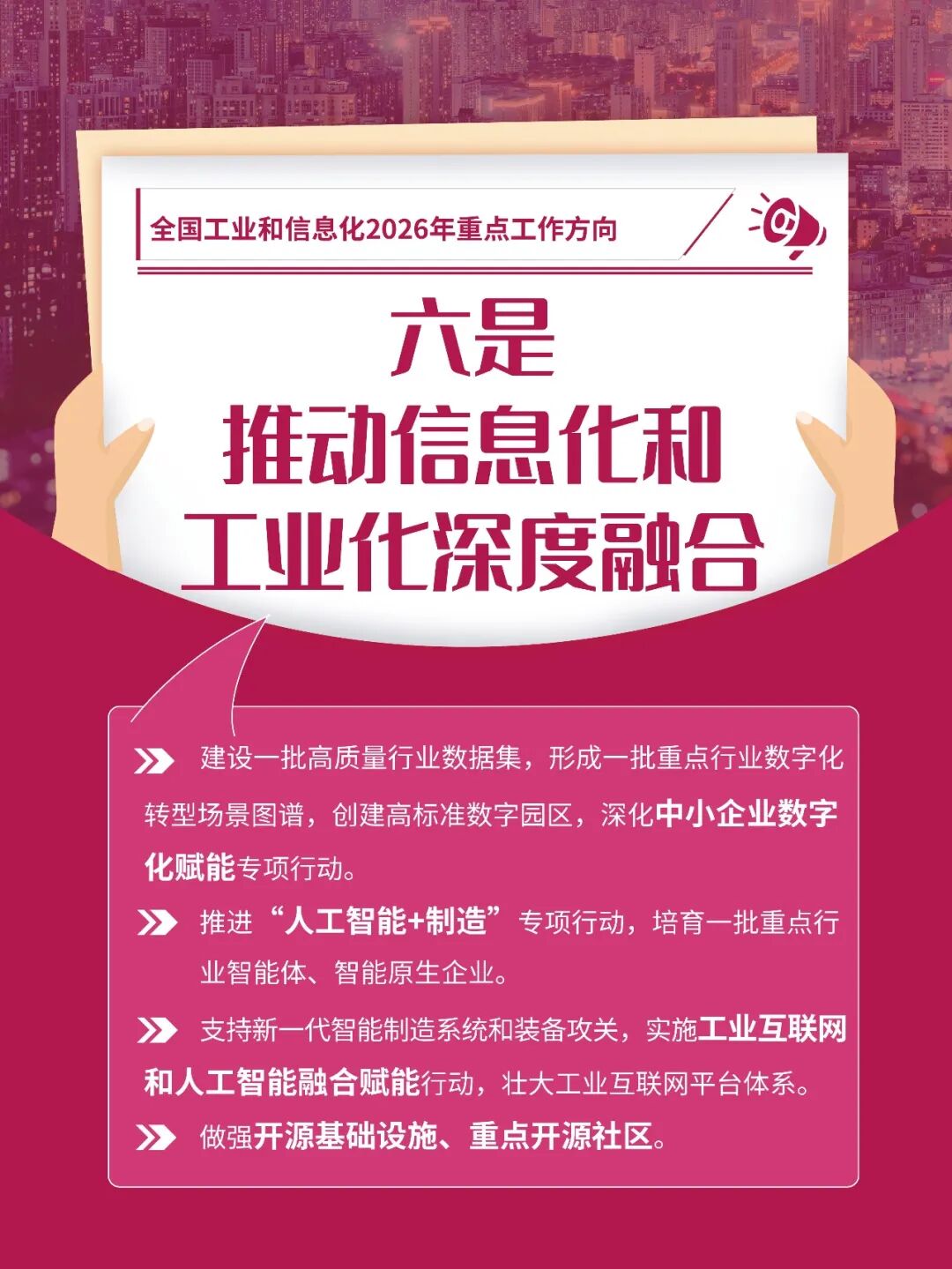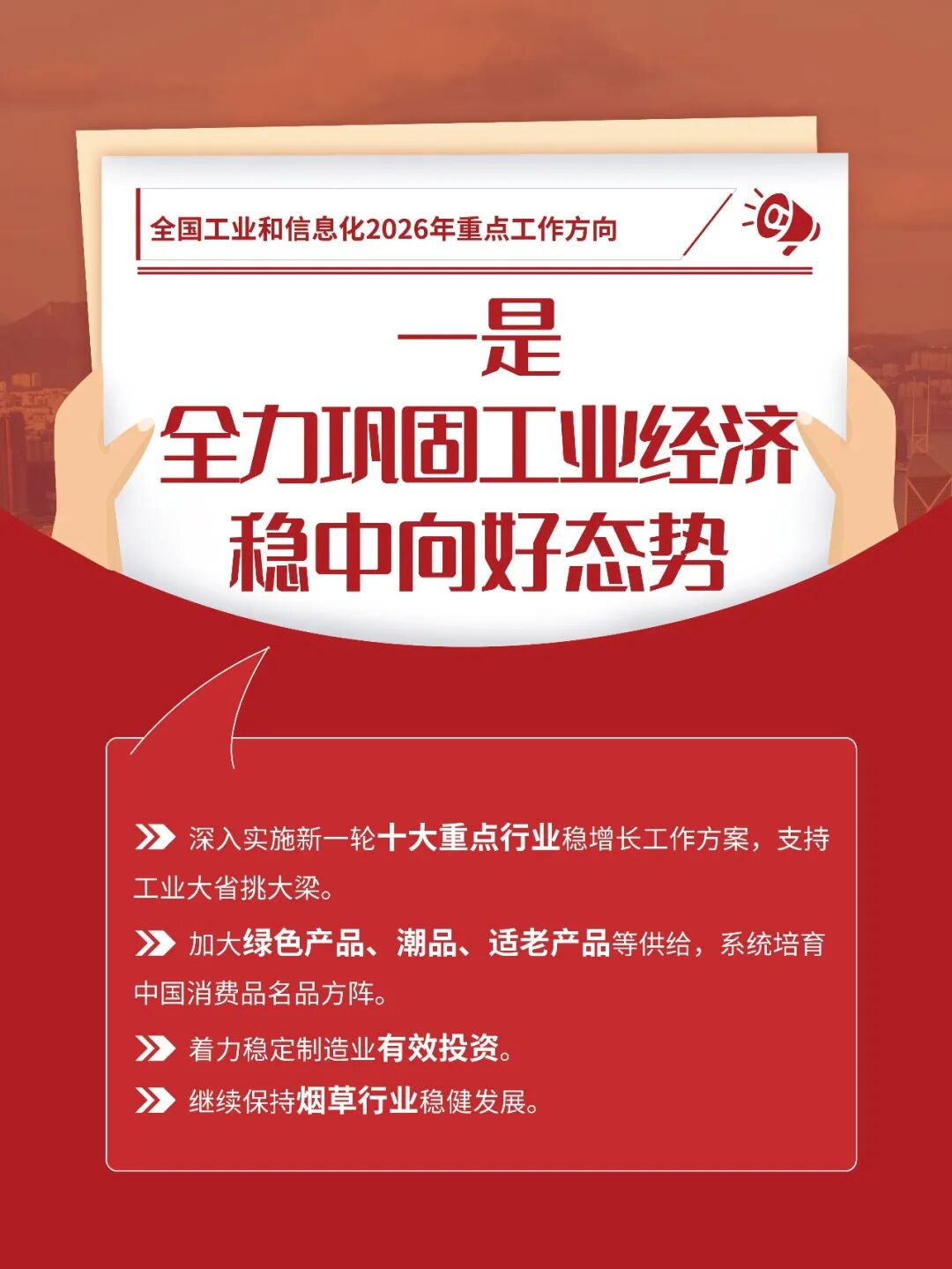 全国工业和信息化工作会议指出,2026年,要以推动高质量发展为主题,坚持稳中求进工作总基调,更好统筹国内经济工作和国际经贸斗争,更好统筹发展和安全,锚定实现新型工业化这个关键任务,进一步全面深化改革,推动科技创新和产业创新深度融合,推动信息化和工业化深度融合,因地制宜发展新质生产力,着力稳增长、强创新、促融合、优治理、防风险,推动工业经济实现质的有效提升和量的合理增长,加快建设现代化产业体系,确保实现“十五五”良好开局。