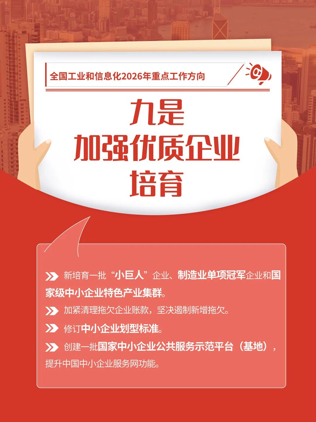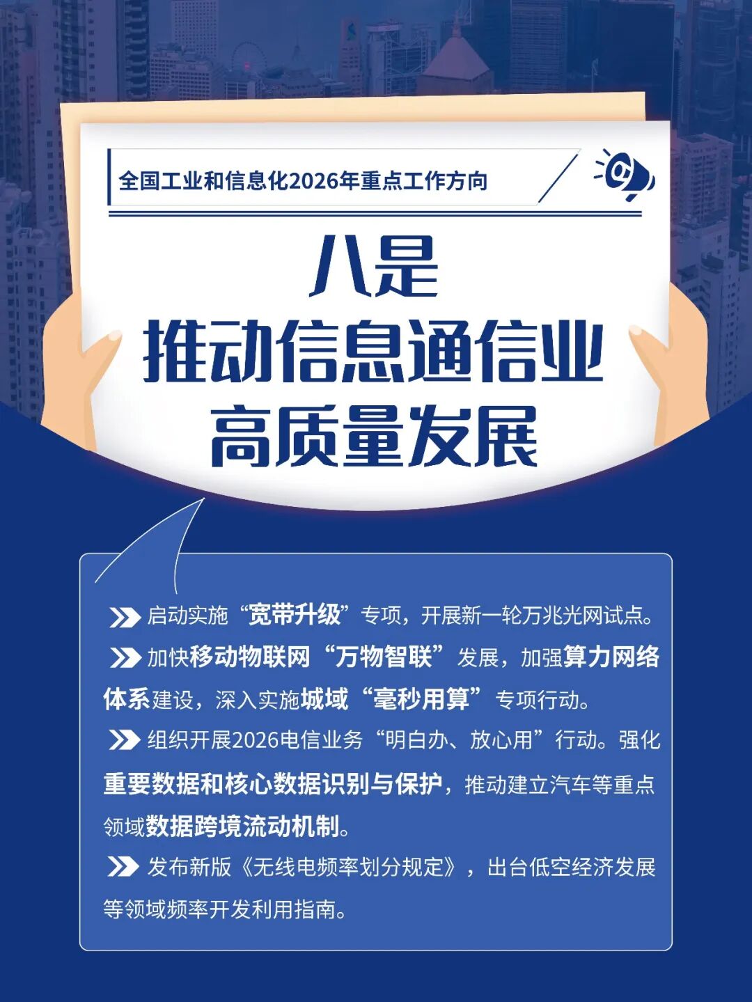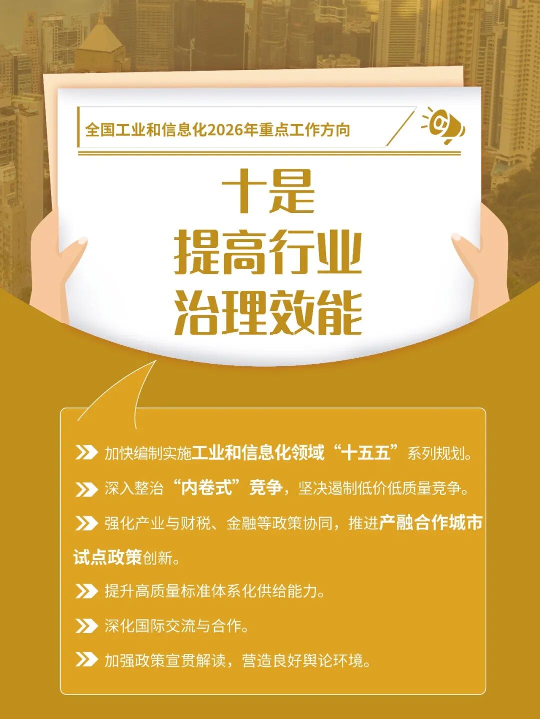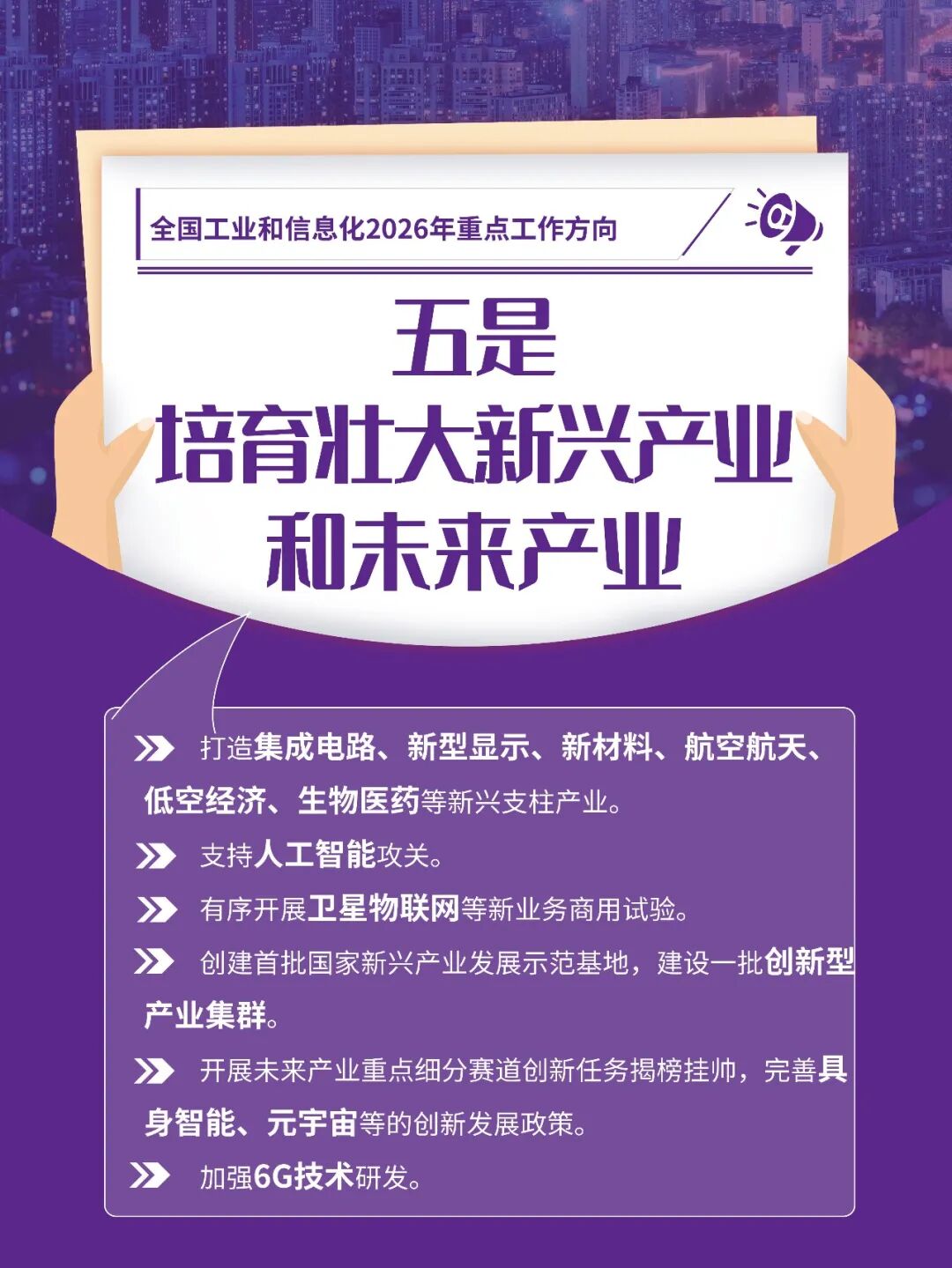 全国工业和信息化工作会议指出,2026年,要以推动高质量发展为主题,坚持稳中求进工作总基调,更好统筹国内经济工作和国际经贸斗争,更好统筹发展和安全,锚定实现新型工业化这个关键任务,进一步全面深化改革,推动科技创新和产业创新深度融合,推动信息化和工业化深度融合,因地制宜发展新质生产力,着力稳增长、强创新、促融合、优治理、防风险,推动工业经济实现质的有效提升和量的合理增长,加快建设现代化产业体系,确保实现“十五五”良好开局。